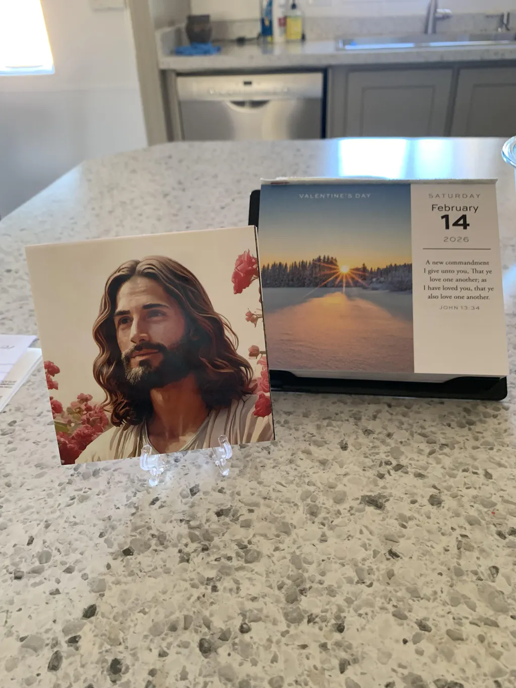 -9 high quality images of Christ (the pictures are designed to coordinate with major holidays and seasonal decor). They are printed double-sided on good quality glossy light weight cardstock and fit on the little easel really well. The prints are 4x4 inches. The back of one of the images tells people what it is and there is room for you to write a message if you are gifting it.