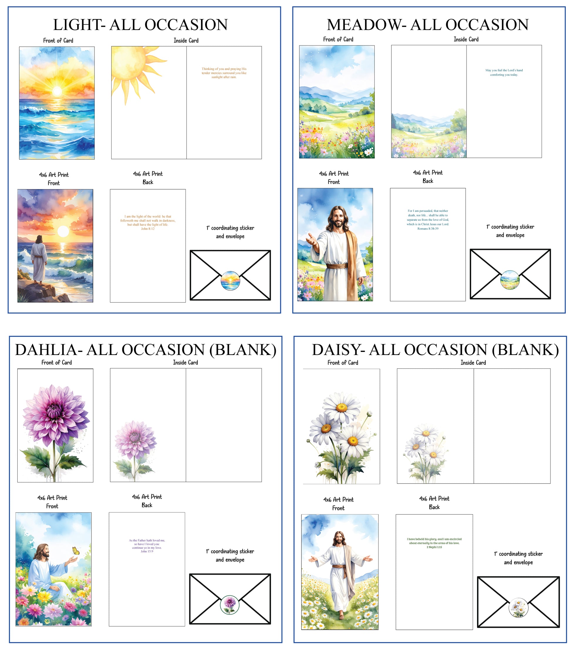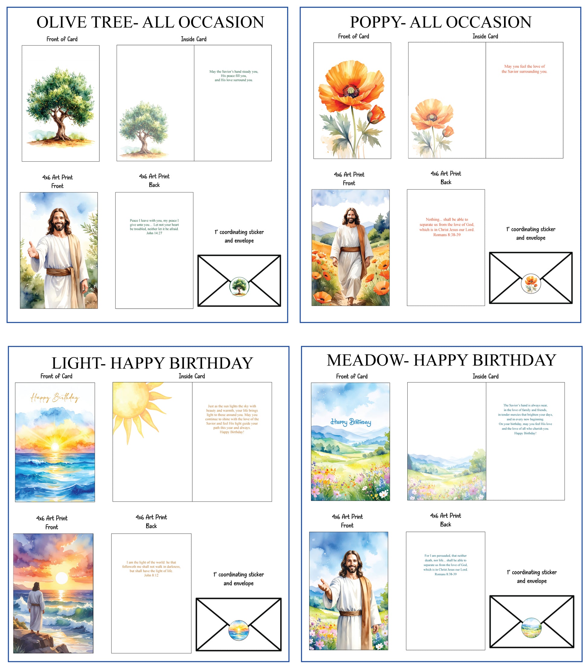 Each card includes a coordinating 4x6 print of the Savior, an envelope, and a coordinating sticker.