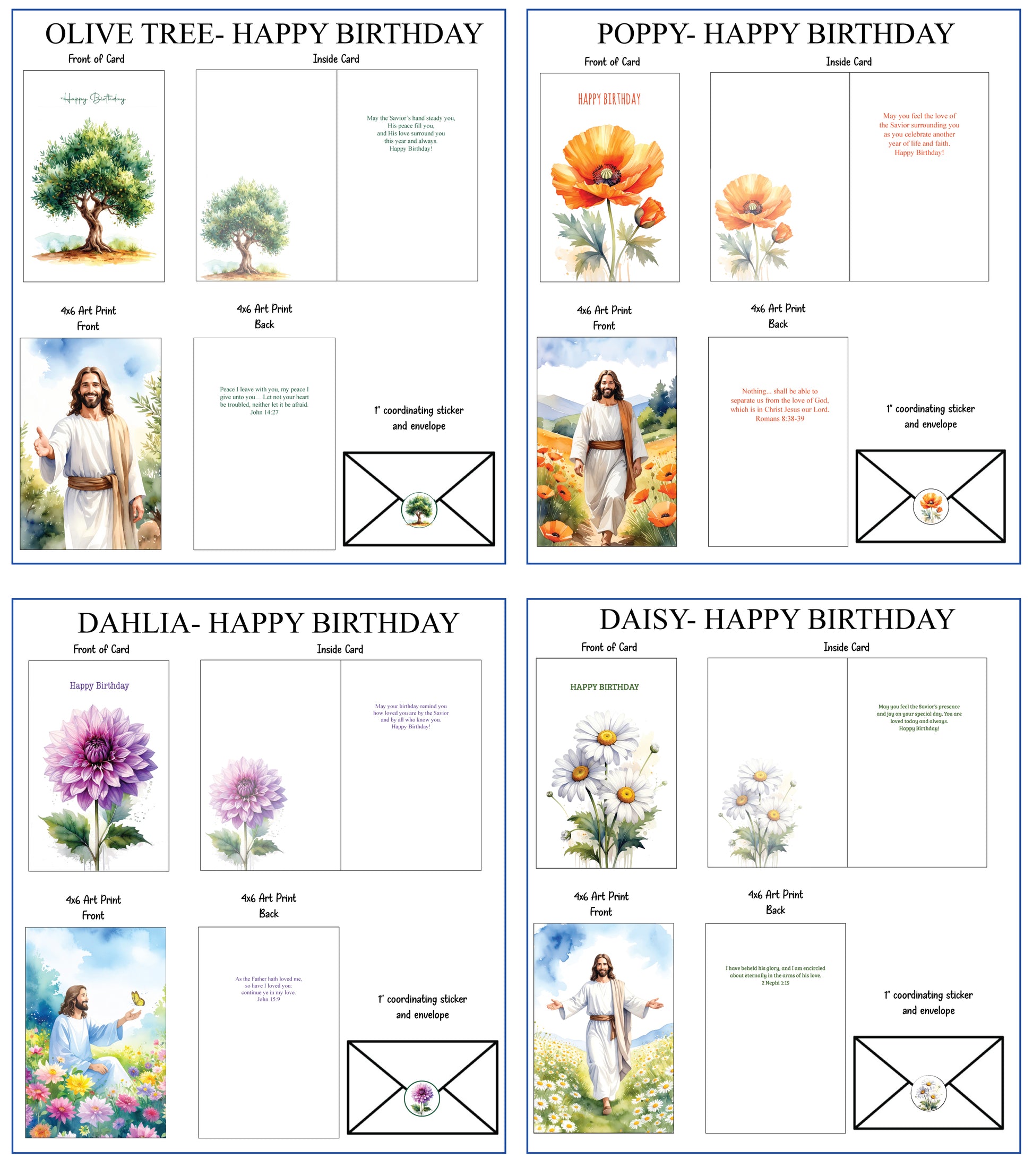 24 greeting cards that fold to be 4 x 6 inches (12 birthday, 4 blank, and 8 all occasion that can be used for missionaries, baptisms, endowments, thank you, sympathy, new calling, etc,)